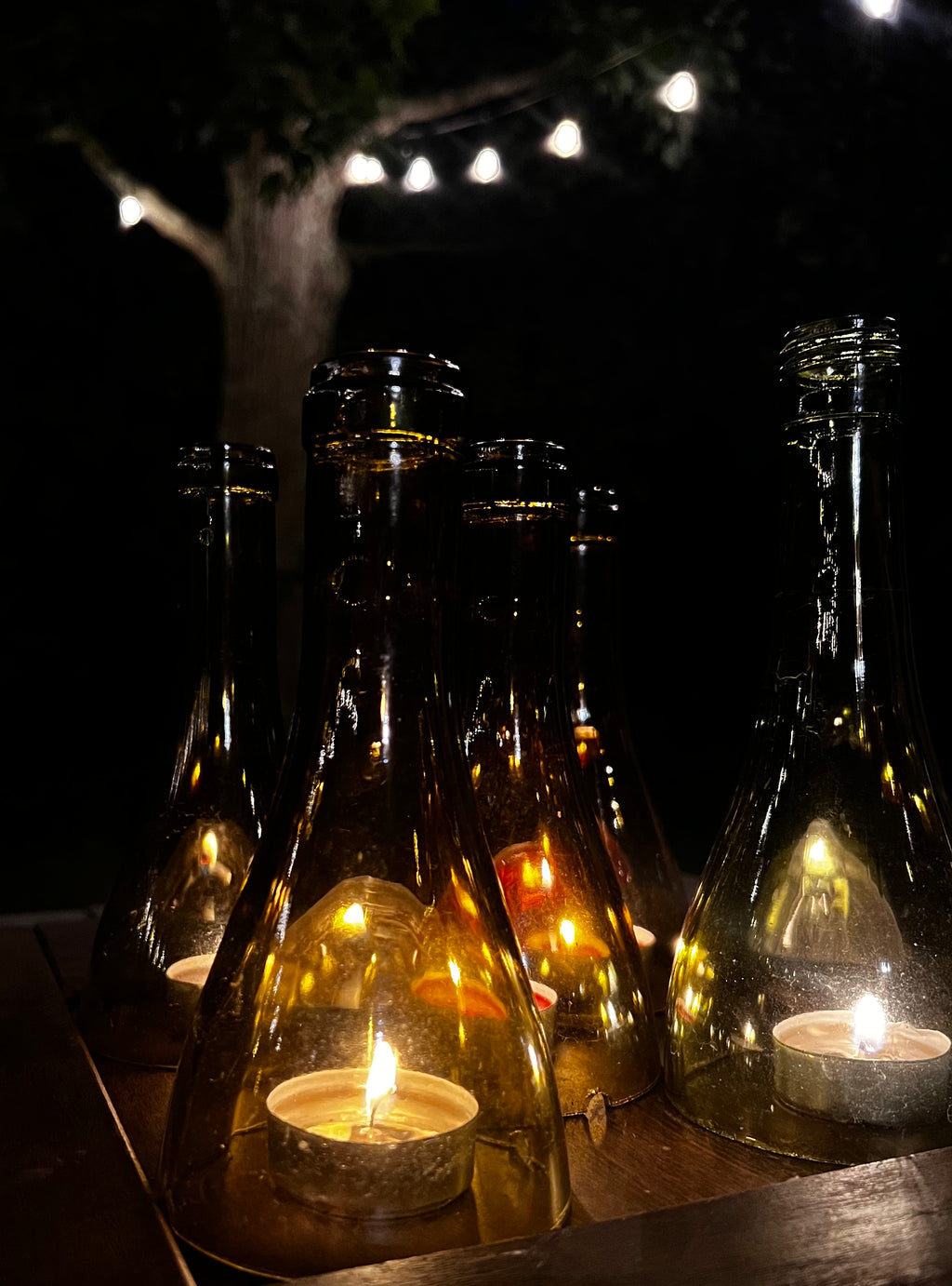 Each tray features upcycled wine bottle tops transformed into petite tealight hurricanes, crafted to shield your flame and elevate your atmosphere. Thoughtful, sustainable, and versatile, these pieces bring both charm and function to your home or patio.
